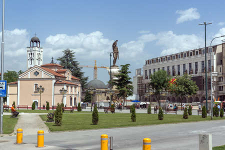 SKOPJE, NORTH MACEDONIA - AUGUST 7, 2019 : City center of Skopje with sculptures and buildings. Skopje is capital city of Macedonia, Fyrom.