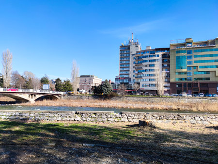 Nis, Serbia - August 28, 2019: Citiscape of river Nisava and a quay promenade on summer sunny day in the city of Nis, Serbia