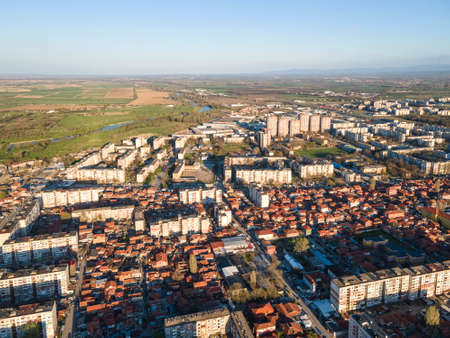 Aerial sunset view of town of Petrich, Blagoevgrad region, Bulgaria
