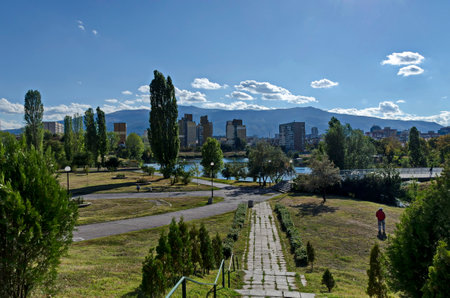 Autumn panorama of part of the neighborhood by the lake with green trees, shrubs and sunburned grass, Drujba, Sofia, Bulgaria