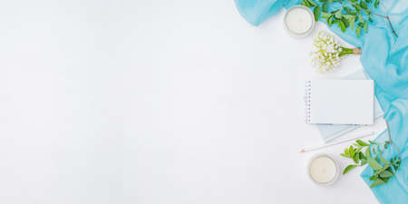 Flat lay blogger or freelancer workspace with a notebook and scarf, white flowers, branches with green leaves on white background