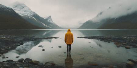 man mountain yellow hiking water nature cape lake concept travel back background. Generative AI.