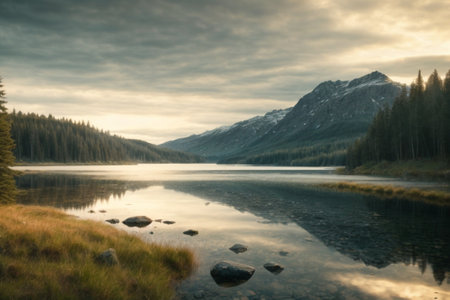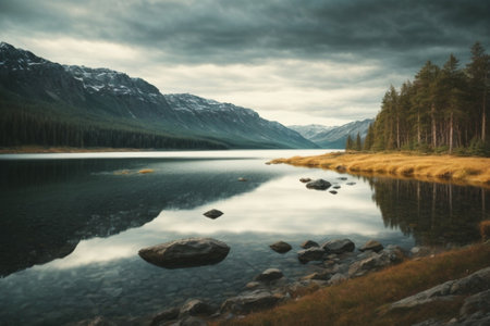 The tranquil mountain range and calm lake create a harmonious natural landscape. Generative AI