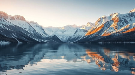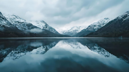 Stunning winter landscape showcasing a serene mountain lake with a perfect reflection of the snowy peaks.