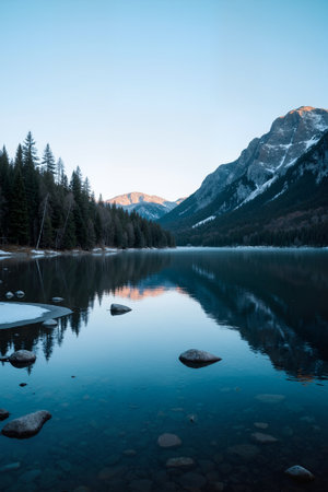 Pristine alpine lake reflecting snow-capped peaks and evergreen trees on a serene winter day