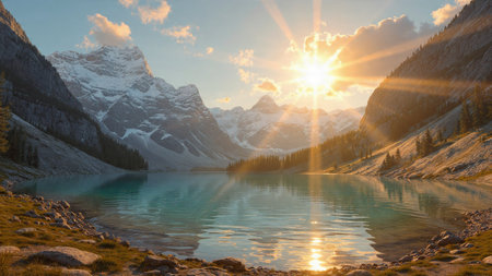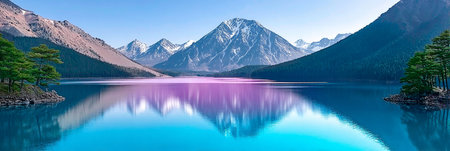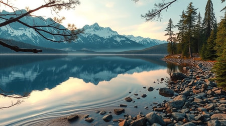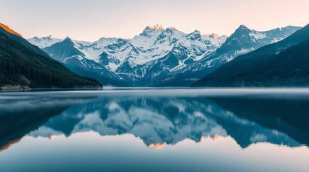 A serene mountain landscape with a tranquil lake reflecting the majestic snow-capped peaks at sunrise.