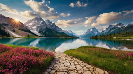 A breathtaking view of a tranquil lake at sunrise, with majestic mountains in the background reflecting on the calm waters, creating a serene and picturesque landscape.
