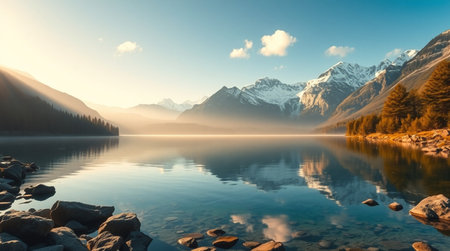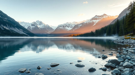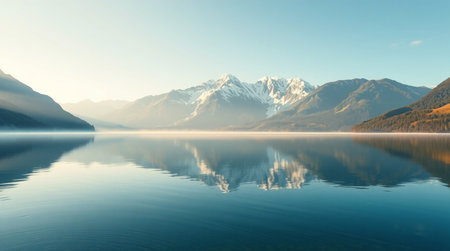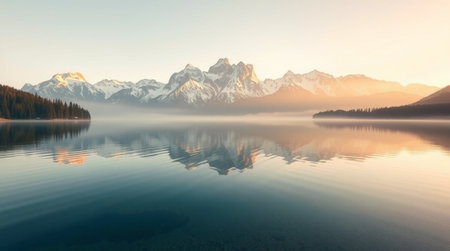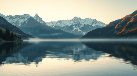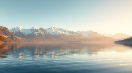A serene mountain lake at dawn background with calm waters, rising mist, and the textures of rugged peaks and tranquil reflections, creating a peaceful and majestic natural scene.