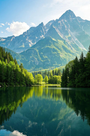 In the morning light a serene landscape unfolds, where the tranquil lake reflects the majestic mountains and their enchanting surroundings, creating a scene that feels both timeless and magical