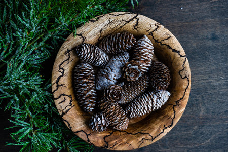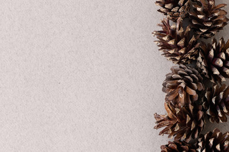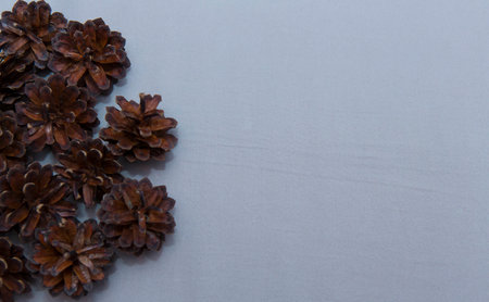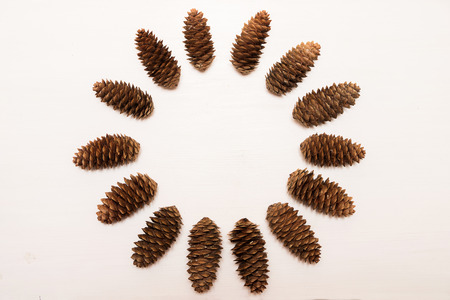 Pine cones composition with copy space in the middle. Top view, flat lay