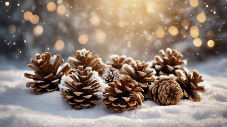 A cozy winter scene featuring pinecones resting on snow, illuminated by warm golden bokeh lights in the background.