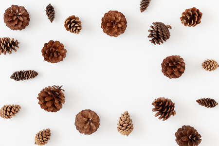 Winter composition, frame made of pine cones on white background. Flat lay, top view