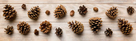 Fir cones flat lay on blue background top view with copy space. Natural, organic forest background. Creative fall, autumn, winter, christmas composition layout. Long banner stock photo.