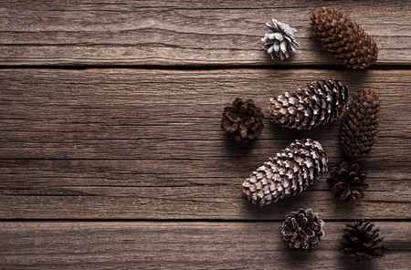 Brown pine and cedar cones on wooden background. Studio Photo