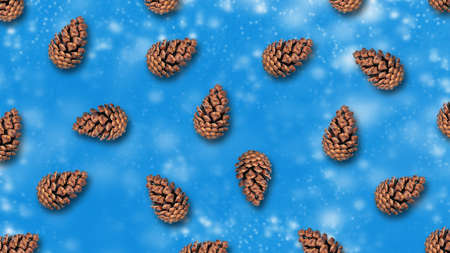 A lot of cones on a blue background. New Year. Christmas background. Festive background.