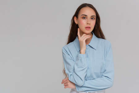 portrait of beautiful woman in blue shirt looking at camera isolated on grey