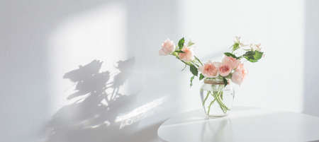 pink roses in glass jar on white modern table on background white wall