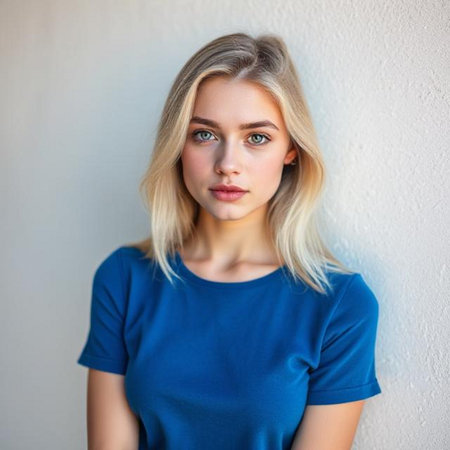 An AI illustration of A beautiful young Caucasian woman stands with confidence in front of a bright blue wall