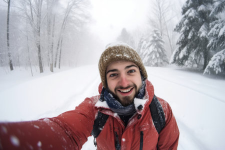 shot of a young man taking selfies while out in the snow, created with generative ai