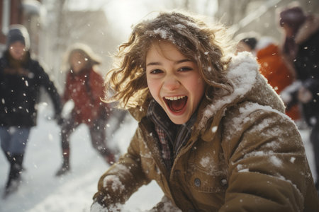 Generative AI : happy girl laughing enjoying life and throws snow at winter outdoors