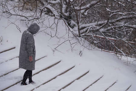 A beautiful sweet girl stands on a city street in winter. It is snowing outside.