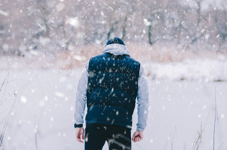 Portrait of a handsome young man with a beard in a warm jacket and a knitted cap on a background of snowfall. Winter fashion.