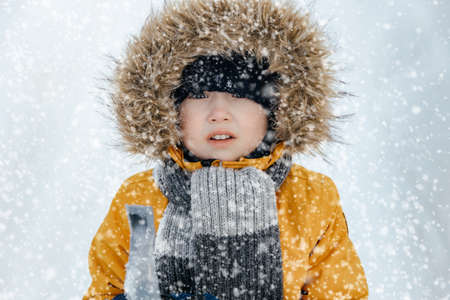 Outdoor winter portrait of little healthy happy baby child walking in the park on cold day with snow and snowfall. Stylish clothes for kids.