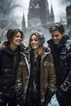 Stylish man posing in winter clothes, surrounded by falling snowflakes on a bustling city street during the chilly holiday season