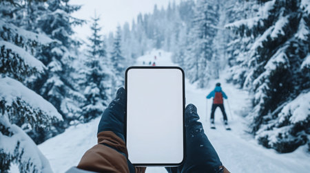 A person holds a phone with a blank screen in front of a snowy mountain path