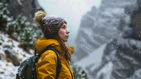 A woman wearing a hat and a coat stands observing the vast mountains ahead, carrying a backpack on her shoulders. Active lifestyle. Sports and tourism.