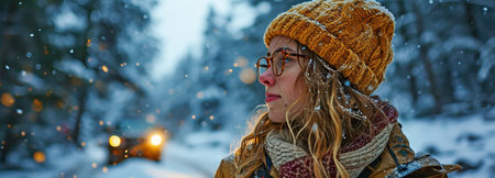 A young woman walking in a snowy park during winter, wearing a cozy sweater and a knitted hat, with snowflakes falling around her