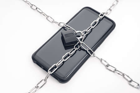 Modern smartphone with chain locked by padlock in mans hand. Information security or smartphone addiction concept