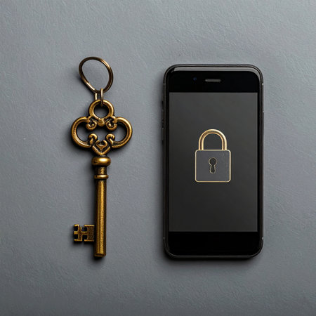 A vintage brass key, a timeless symbol of security, rests beside a modern smartphone displaying a digital padlock.