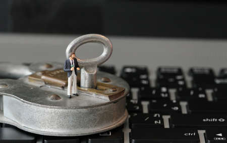 Internet security concept-miniature businessman stand on old key and padlock on laptop computer keyboard
