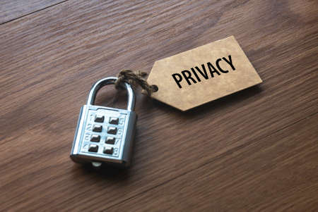 Vintage padlock and colored wooden cube with the word DATA PRIVACY.