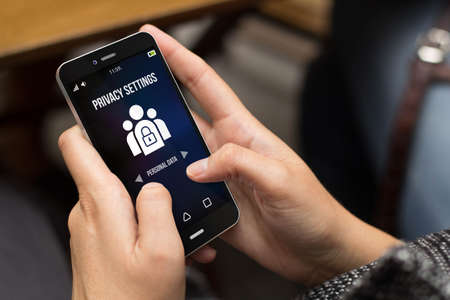 security concept: girl using a digital generated phone with privacy settings on the screen. All screen graphics are made up.