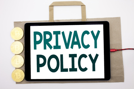Handwritten text showing Privacy Policy. Business concept writing for Safety Data Rules Written on shopping bag and tablet white background, tablet charging with cryptocurrency bitcoin.