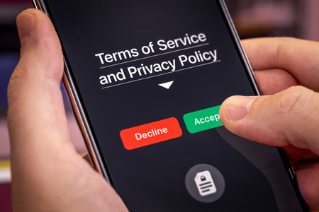 Smartphone user agrees to accept Terms of Service and Privacy Policy mobile app. Finger touches the Accept button. Dark app interface with Accept and Decline buttons
