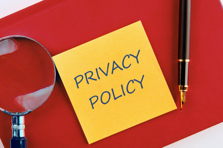 Concept Privacy Policy text written on a yellow sticker on a red business notebook in a composition with a magnifying glass and a fountain pen