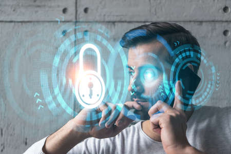 A man in casual wears, talking phone. Double exposure. LOCK icons drawings hologram. Security datum concept.