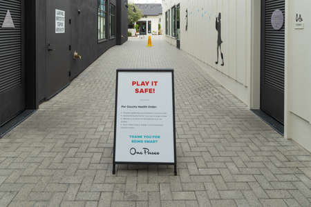 Empty outdoor shopping mall with informative signage during COVID-19 pandemic. Coronavirus virus panic and quarantine San Diego, USA, April 5th, 2020