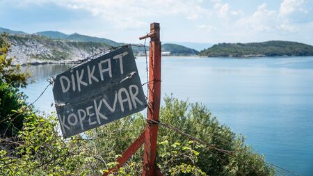 Turkish sign translating Beware of the Dog warning, on a chain link fence and sea backdrop.