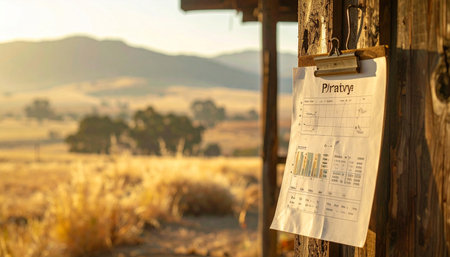 A delivery receipt is clipped to a weathered wooden post, marking the end of a day's work on a rural farm.