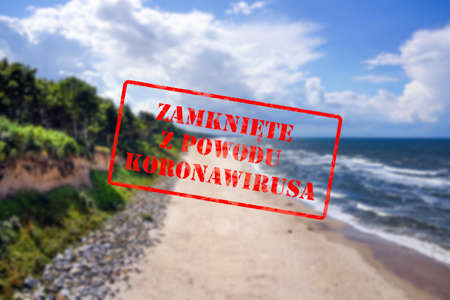 Defocused aerial view of beautiful sandy beach and sea on sunny day, empty and closed due to coronavirus with Polish notice Closed due to Coronavirus