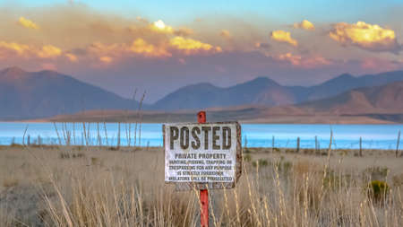 Posted sign against Utah Lake mountain and sky