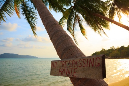 No trespassing sign on tropical palm tree at beach