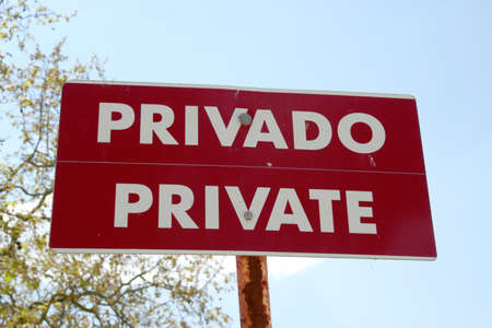 red sign in the field, with the description Private and privado in portuguese