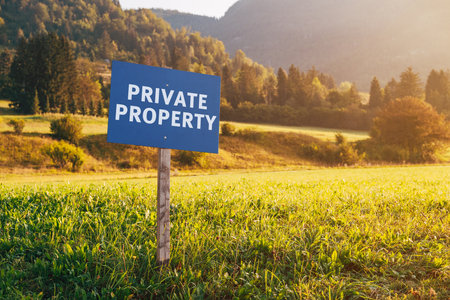 Private property information signboard in countryside meadow landscape, selective focus