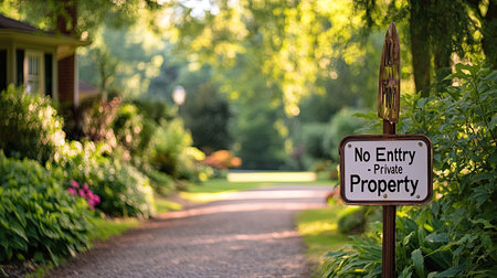 A picturesque pathway surrounded by lush greenery and trees showcases a no entry sign, creating a tranquil atmosphere in a private property setting.