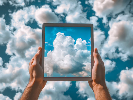 Hands Holding a Digital Tablet with a Blank Screen Above a Cloudy Abstract Background - ai
